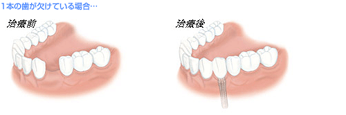 | 失った部分にインプラントを1本埋入します。従来は健全な両隣の歯を削ってブリッジを用いて治療していましたが、インプラントを用いると健全な歯を削ることなく治療を行うことが出来ます。 |