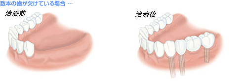 | 従来は局部的な入れ歯を用いて治療を行っていましたが、インプラントを何本か用いて治療を行います。入れ歯を固定するための金属のバネによる違和感がなくなります。 |