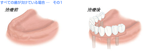| 従来の総入れ歯ではなくインプラントを用いて治療します。この方法なら食物が入れ歯と歯ぐきの間にはさまったり、入れ歯が合わなくなるようなことはありません。 |